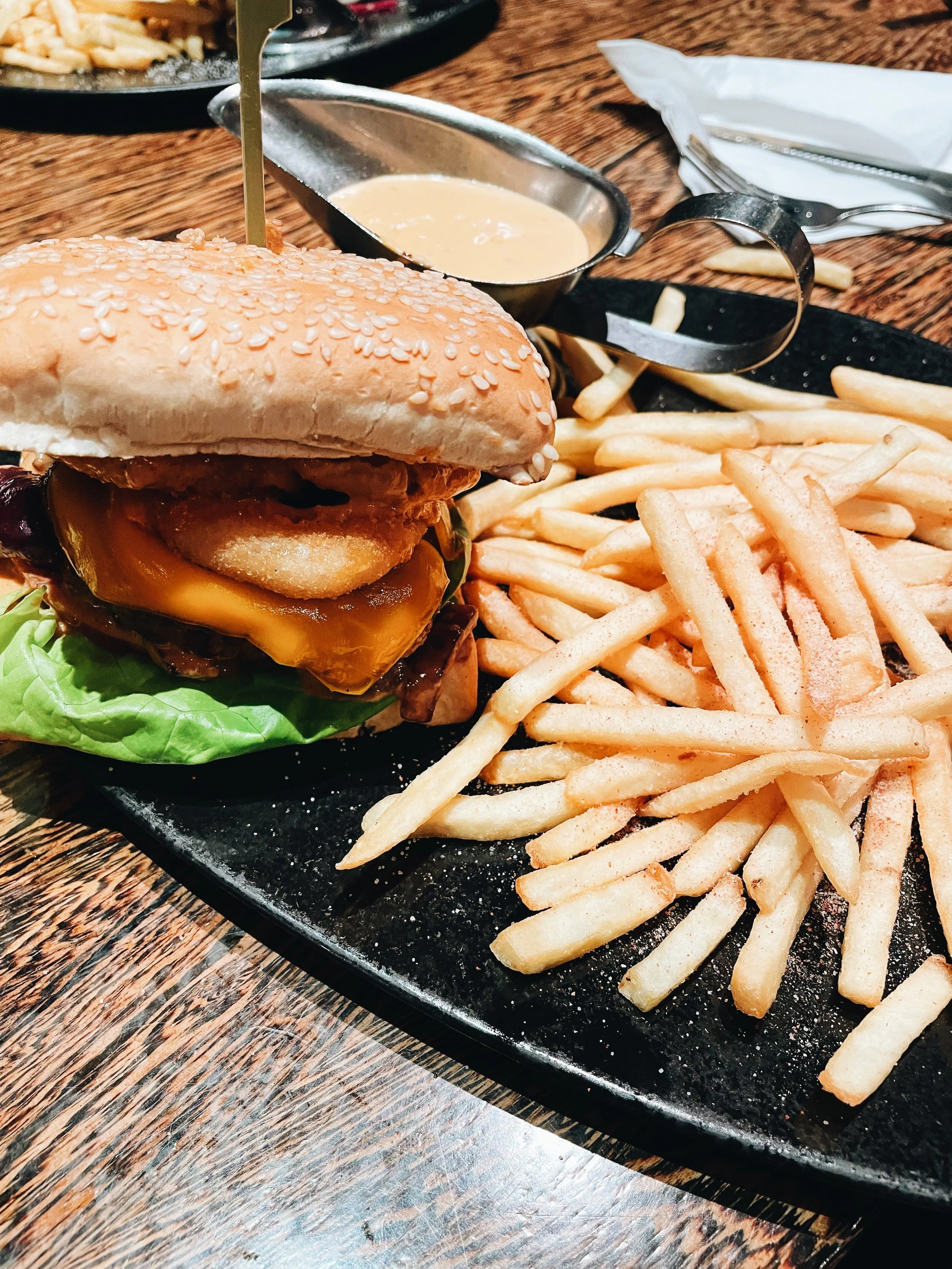Våran burgare är gjord på Anammas formbar färs och andra goda grejer och på den har vi vegansk ost, sallad, tomat, syltat rödlök, lökringar och våran recept på hamburgerdressing. Den är serverad med pommes och vi älskar deras chilimajonnäs som dipp.