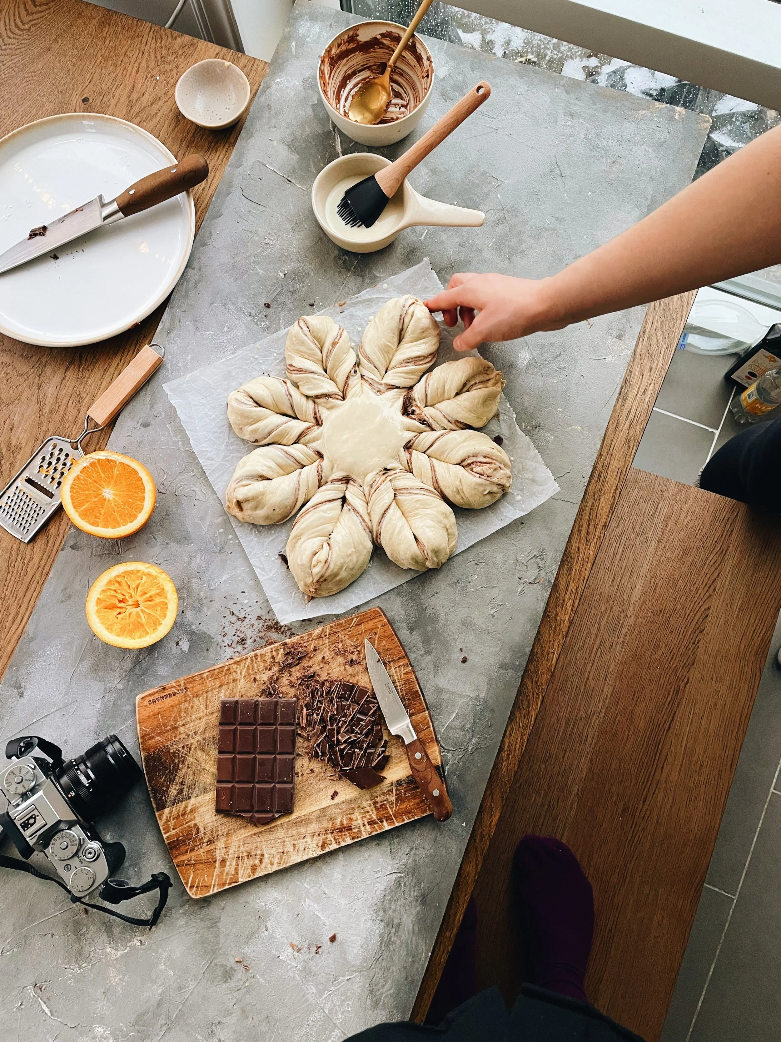 Vi hade så kul men varje dag blev stressig. Ljuset var sämst den veckan och det kändes som vi hela tiden var i ett race med att hinna fota innan det blev mörkt. Men det gick ändå bra och vi gjorde otroligt smarriga recept. På den här bilden har vi en julstjärna fylld med appelsinchokladfyllning. Saftig och god.