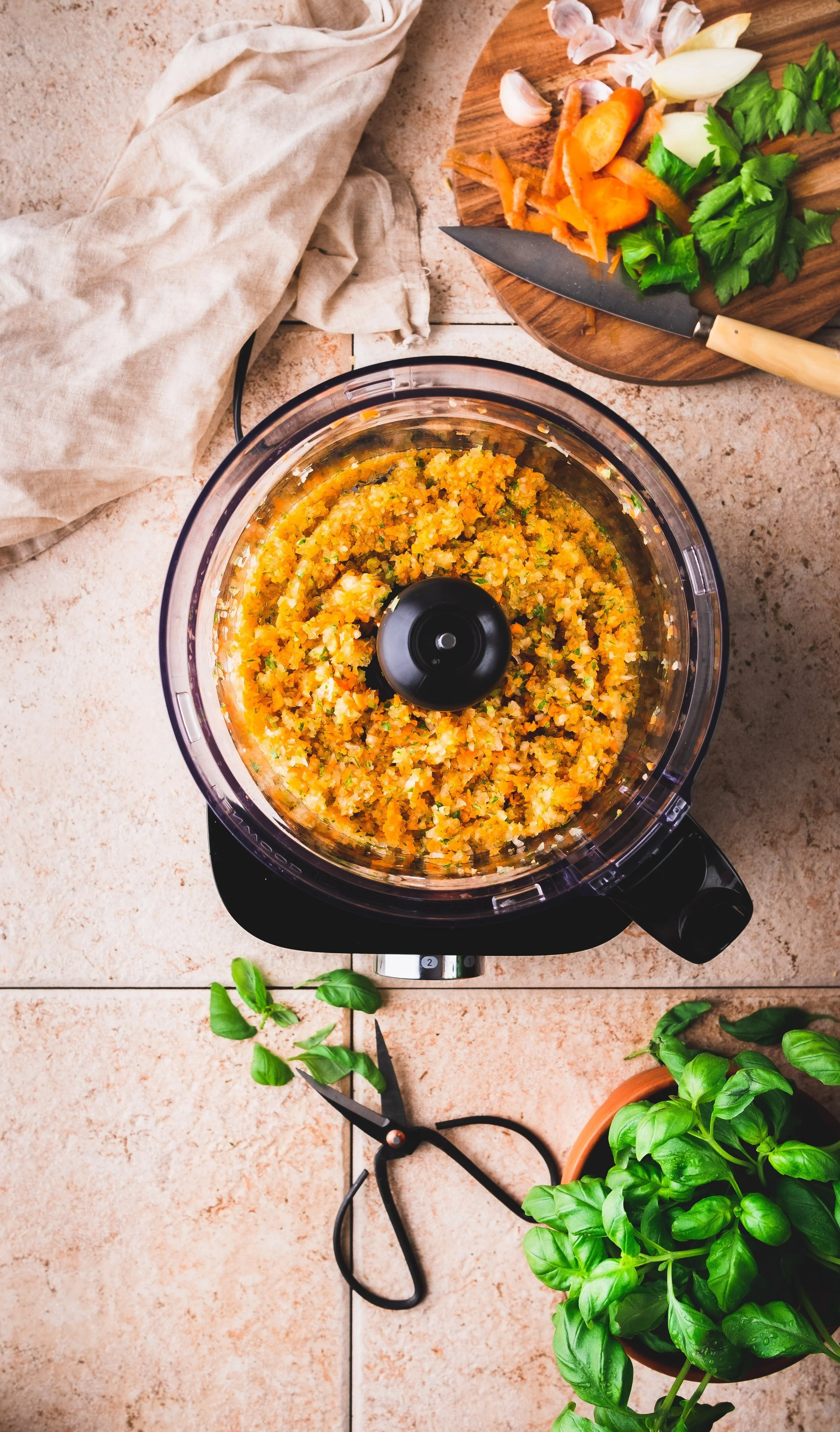 - Hacka morot, selleri och lök i en matberedare. Om ni inte har en sån rekommenderar jag att riva moroten och hacka löken och selleri väldigt smått.