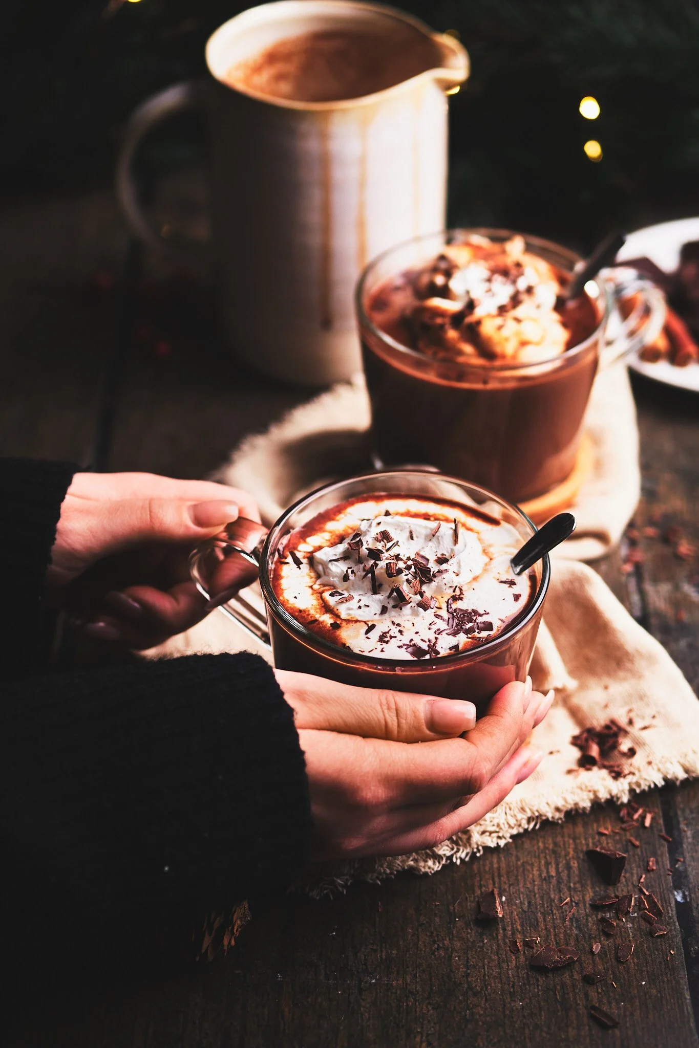 Varmt choklad får mig alltid att tänka på julen. Mamma brukar göra det på juldagen och servera med våfflor toppade med isländsk rabarbersylt och vispad grädde. På grund av den traditionen har varma chokladen blivit en viktig del av julen för mig. Om ni är sugna att göra våfflor och varmt choklad har jag smarrigt recept på våfflor här.