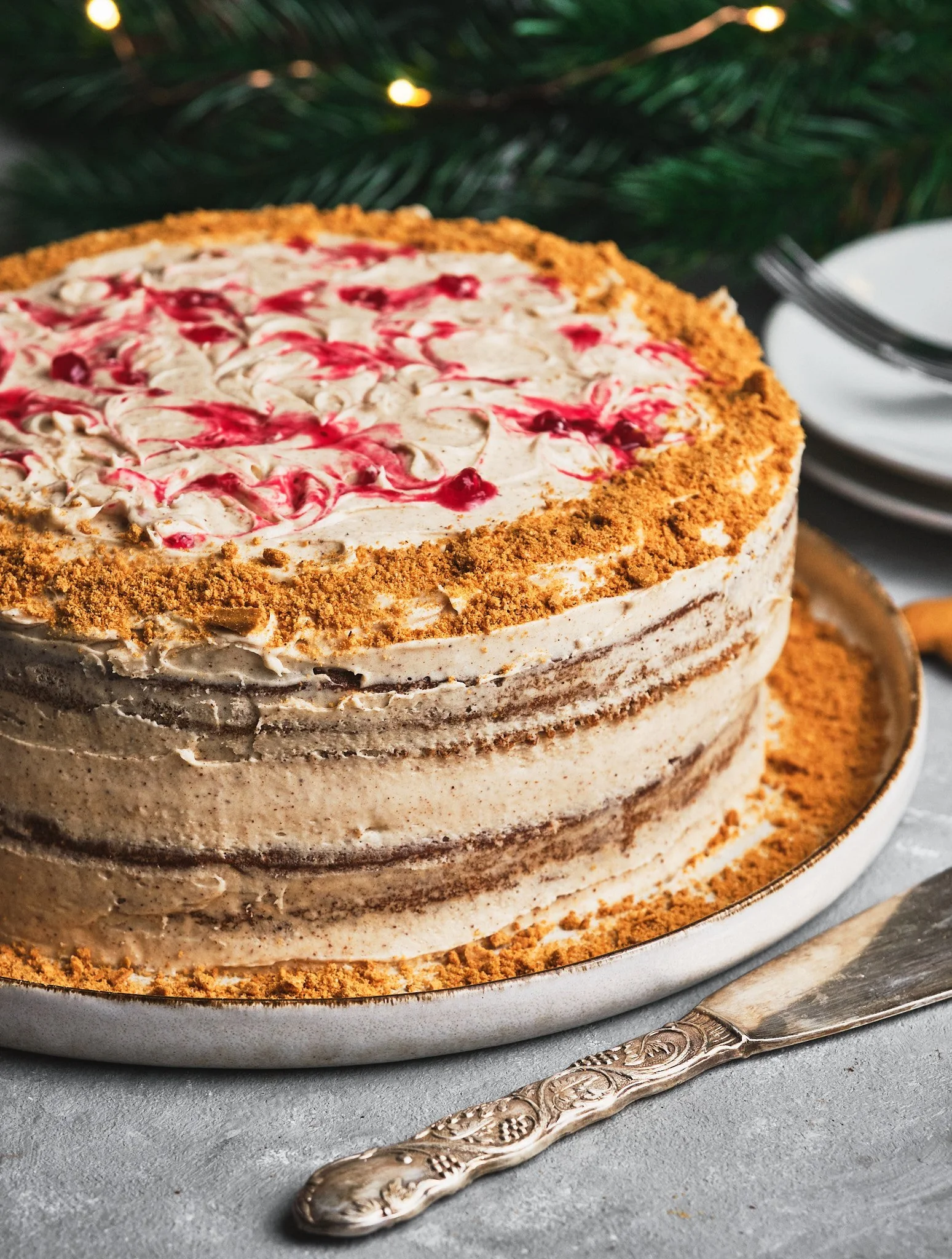 - Bred på kakan och dekorera med det ni tycker om. Jag krossade pepparkakor och gjorde swirls med lingonsylt på toppen.