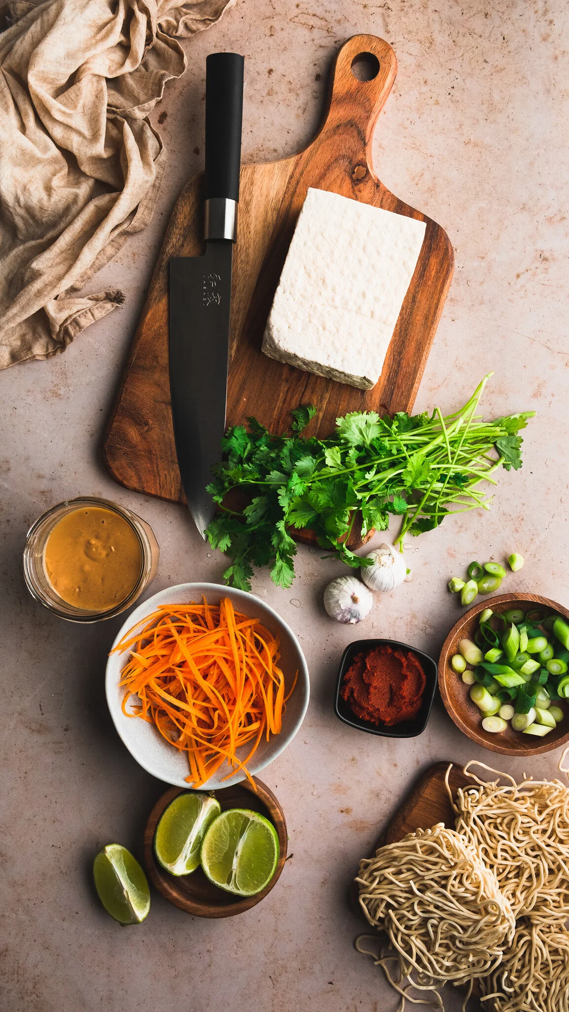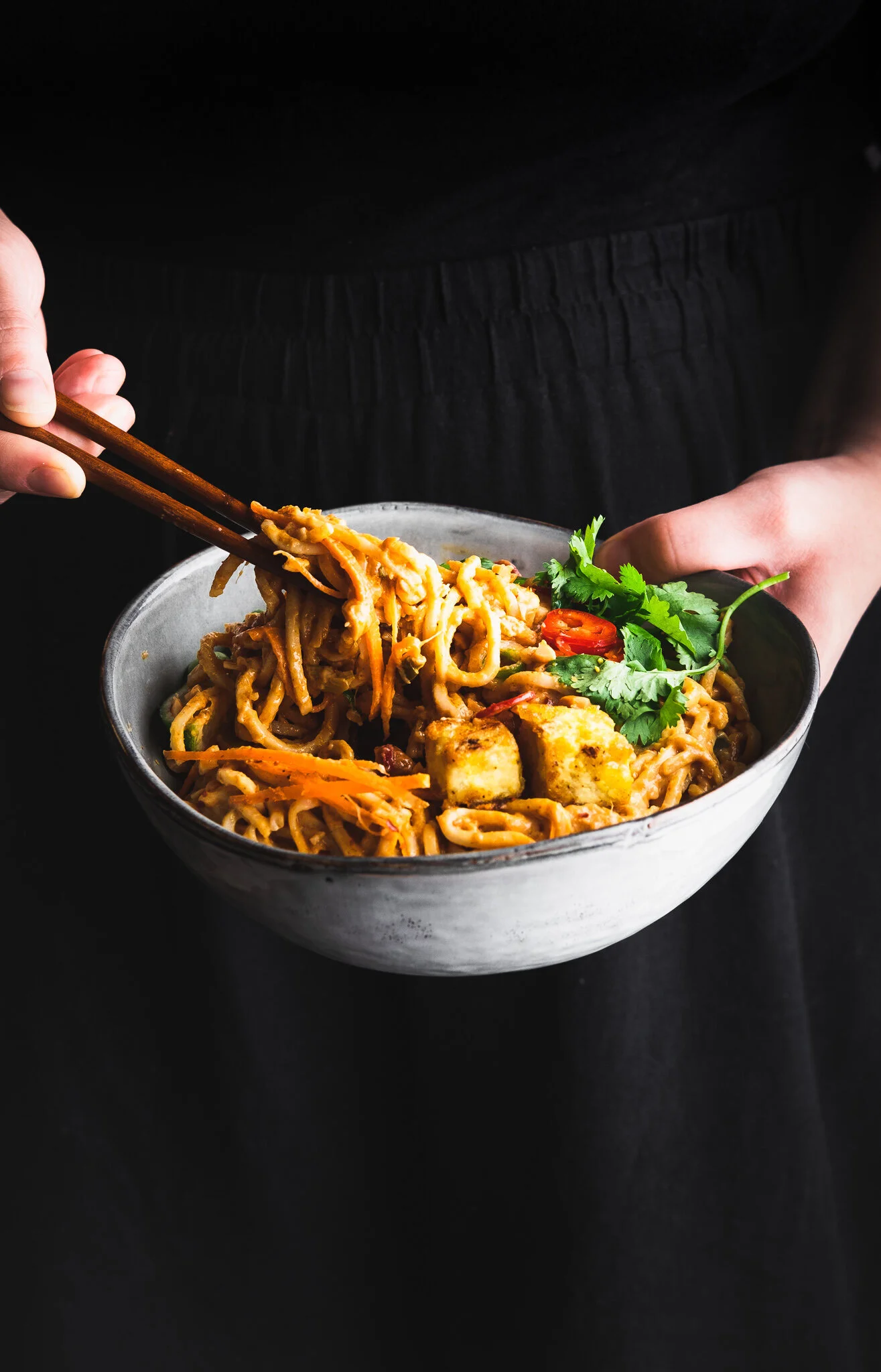 Dessa matiga nudlar med tofu och jordnötssås är min version av min favorit veganska take-away mat. Den tar bara 30 minuter att laga och är därför perfekt som vardagsmat. Vem älskar inte ett snabbt, enkelt recept som samtidigt är SUPER gott!?!