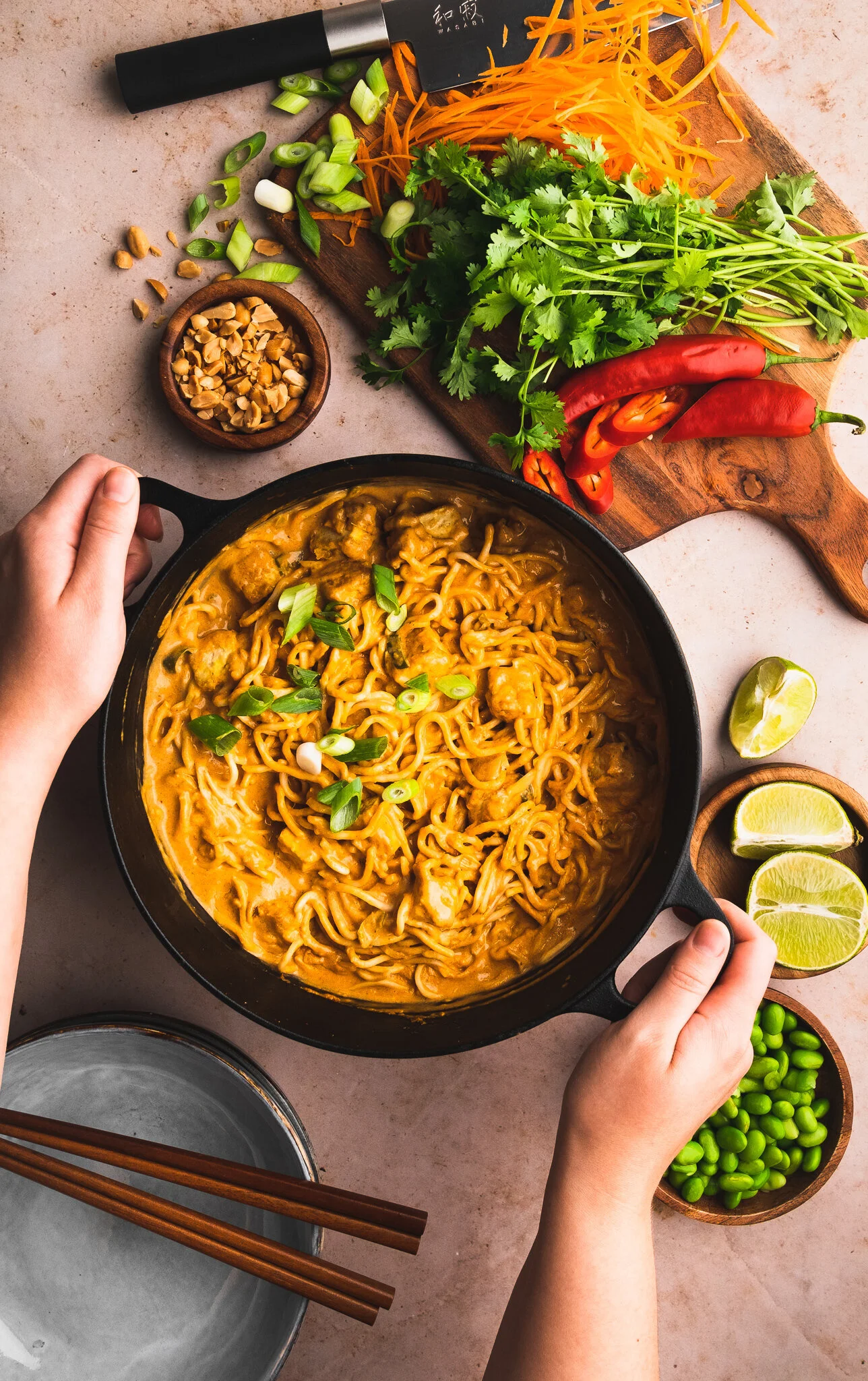 - Tillsätt matlagningsgrädden och sojan till såsen. Smaka den innan ni tillsätter sojan. Jag använder ca 2 tsk och min blev ganska salt. Perfekt för min smak, men vissa är lite känsligare för salt och det är lättare att salta lite i efterhand. Tillsätt nudlarna och låt puttra tills dom blir mjuka. Tillsätt även tofubitarna i såsen de sista 5 minutterna. Pressa ner limejuice när den är färdig.