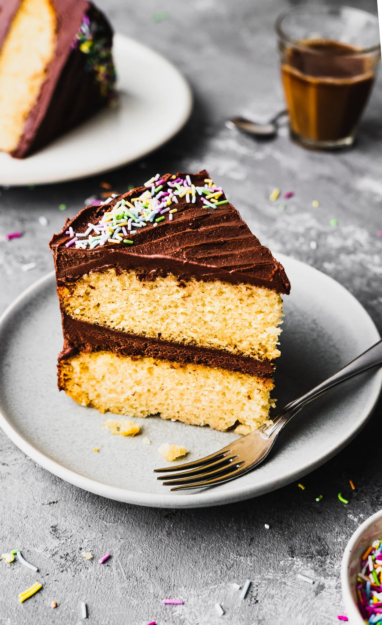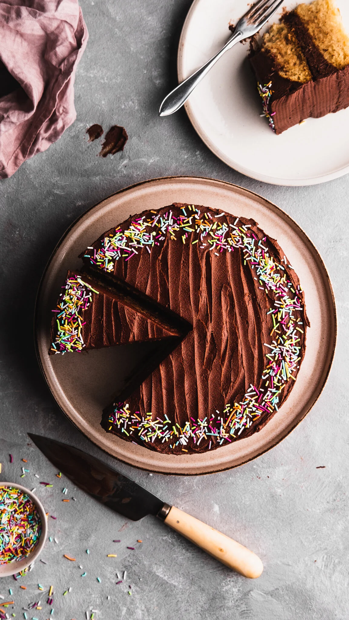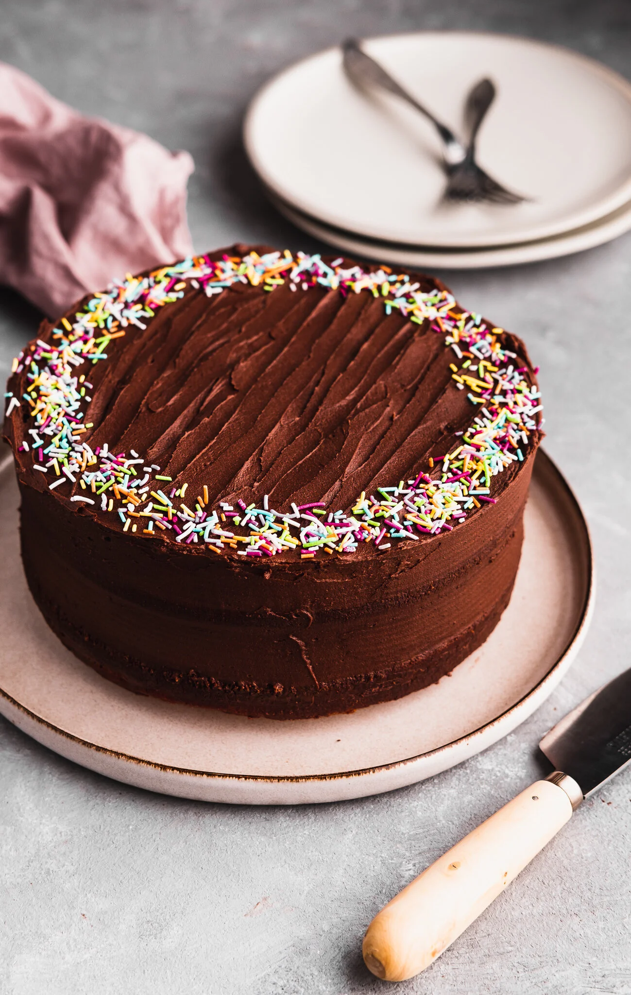 Idag delar jag med er recept på en ljuvlig vegansk tårta med chokladfrosting, toppad med strössel! En enkel och god tårta som är jättegod till kaffet. Serverad med färska bär eller vegansk vispgrädde blir den också en super god dessert.