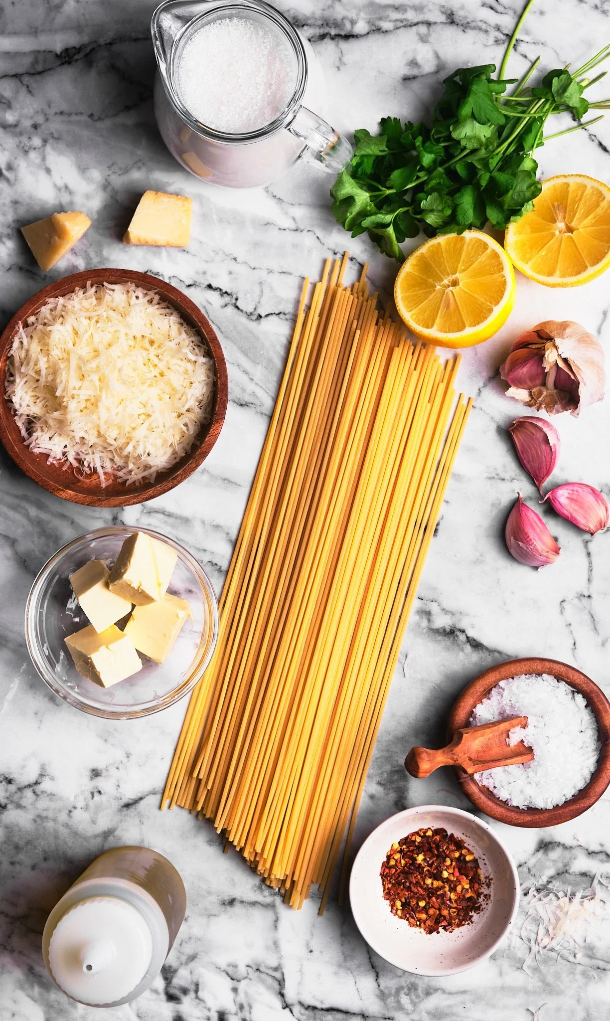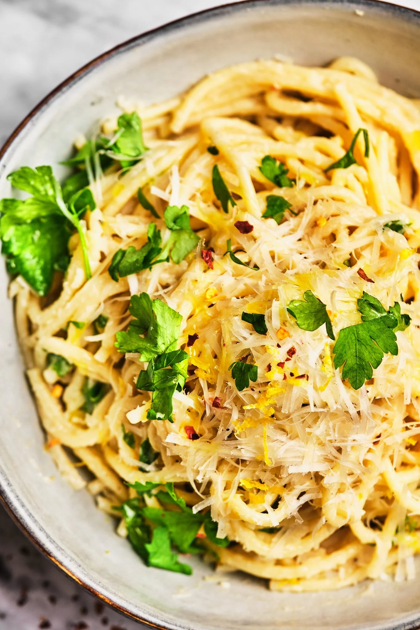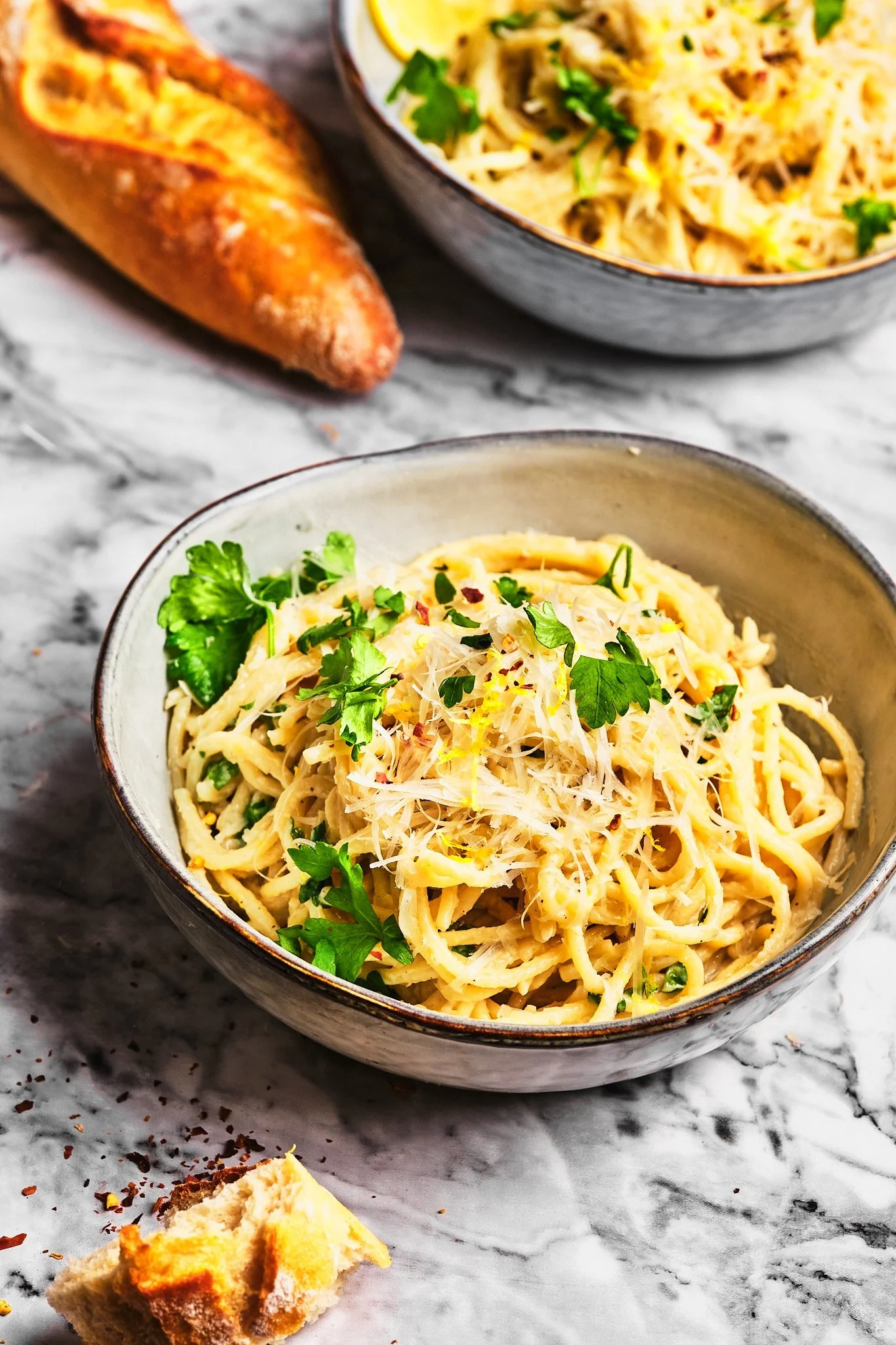 Idag delar jag med er recept på otroligt krämig och god vegansk citronpasta med vegansk parmesan, chiliflakes och persilja. Receptet är enkelt, snabbt och lättlagad men samtidigt så himla smarrigt. Den krämiga såsen får en härlig frisk smak av citronen och persiljan och jag rekommenderar verkligen att servera pastan med gott bröd.