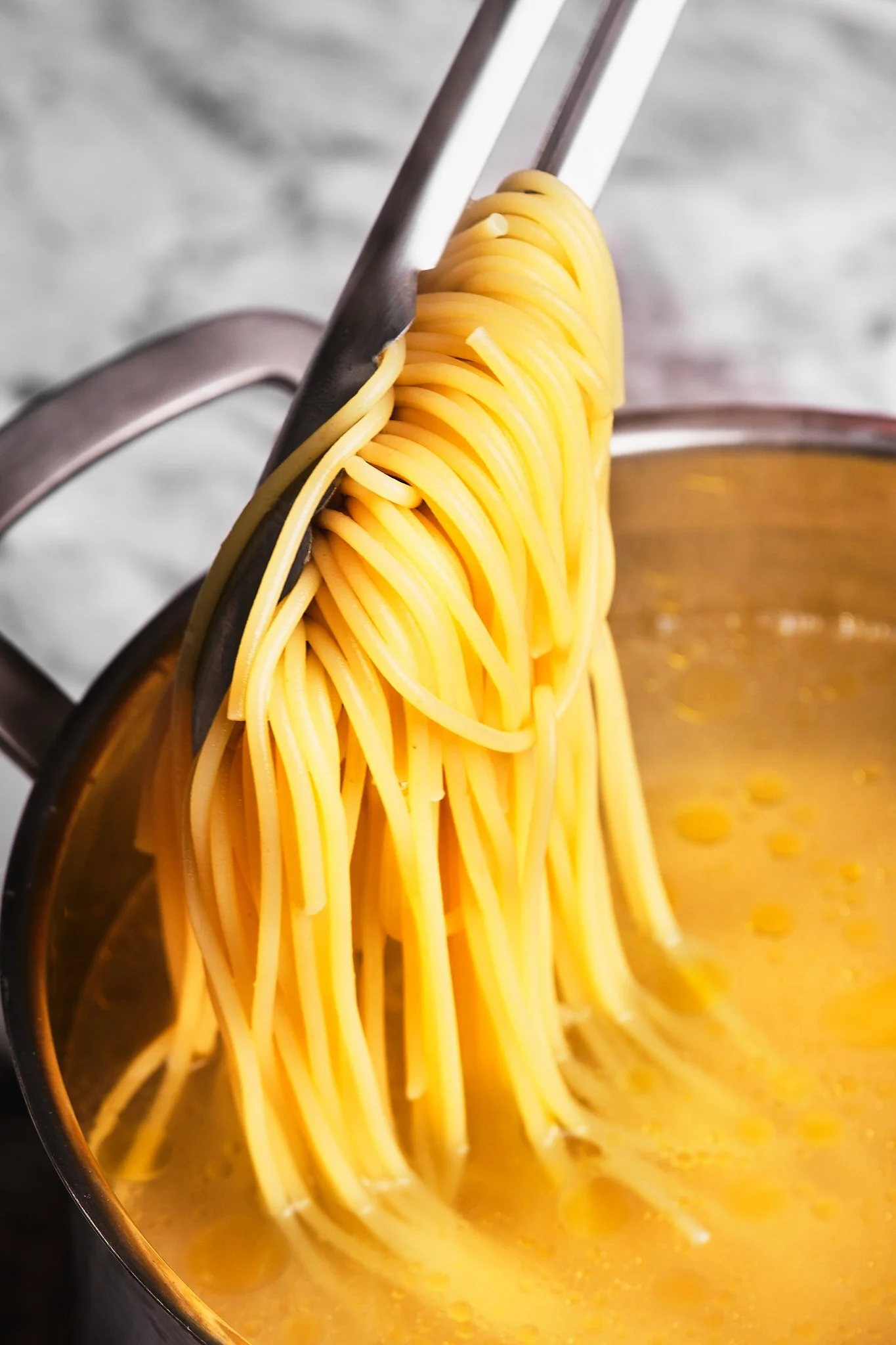 Jag använde spaghetti denna gången men jag tycker det går även superbra att använda t.ex. linguine eller rigatone. Passa på att koka den inte för mycket. Den ska vara “al dente” och ha lite tuggmotstånd när ni häller av vattnet.