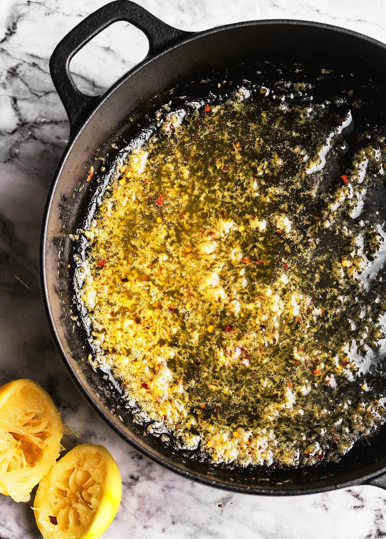 Åhh jag ÄLSKAR verkligen doften av olivolja, vitlök, citronskal, citronjuice och chiliflakes. Så himmelskt god.