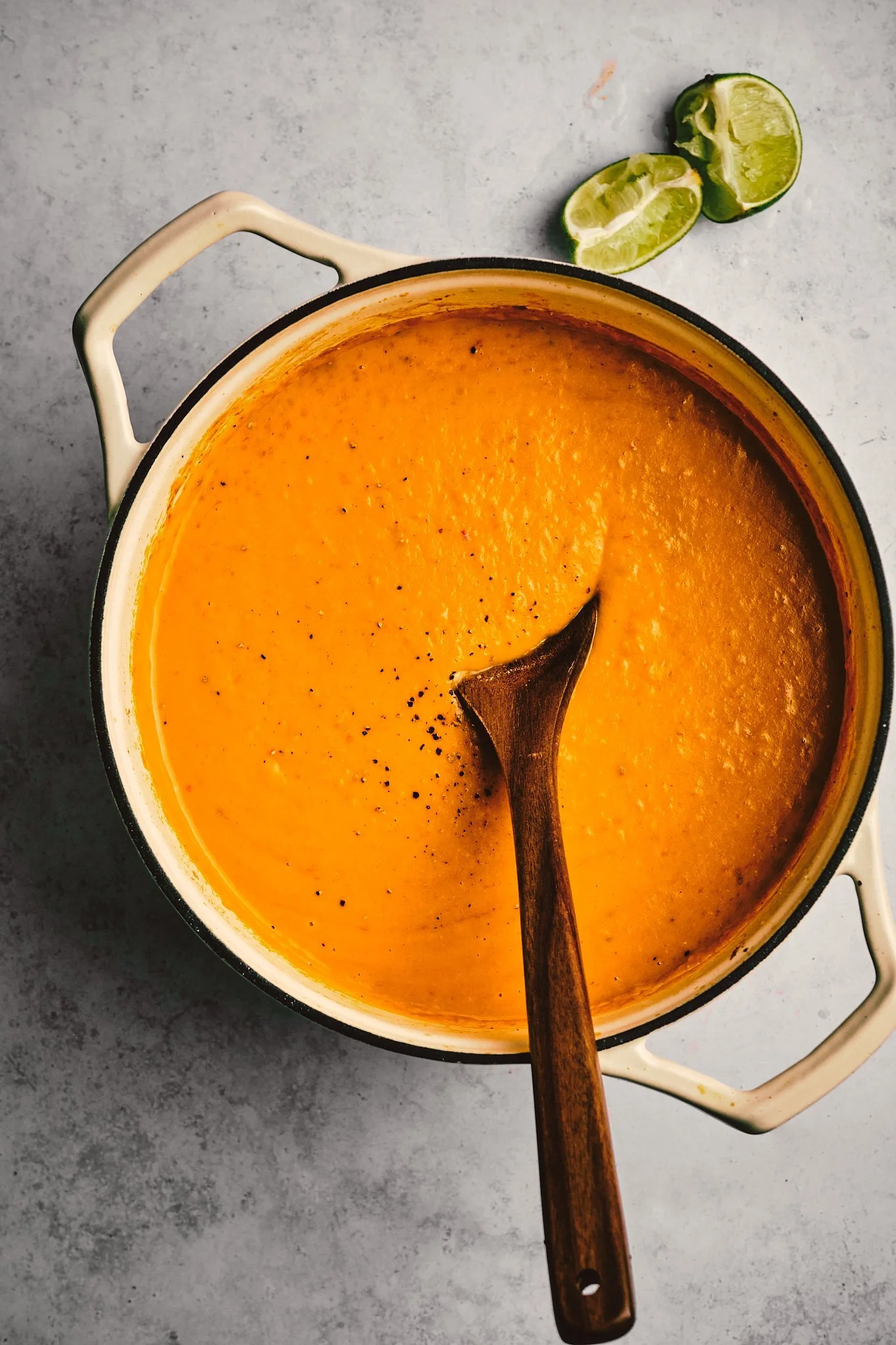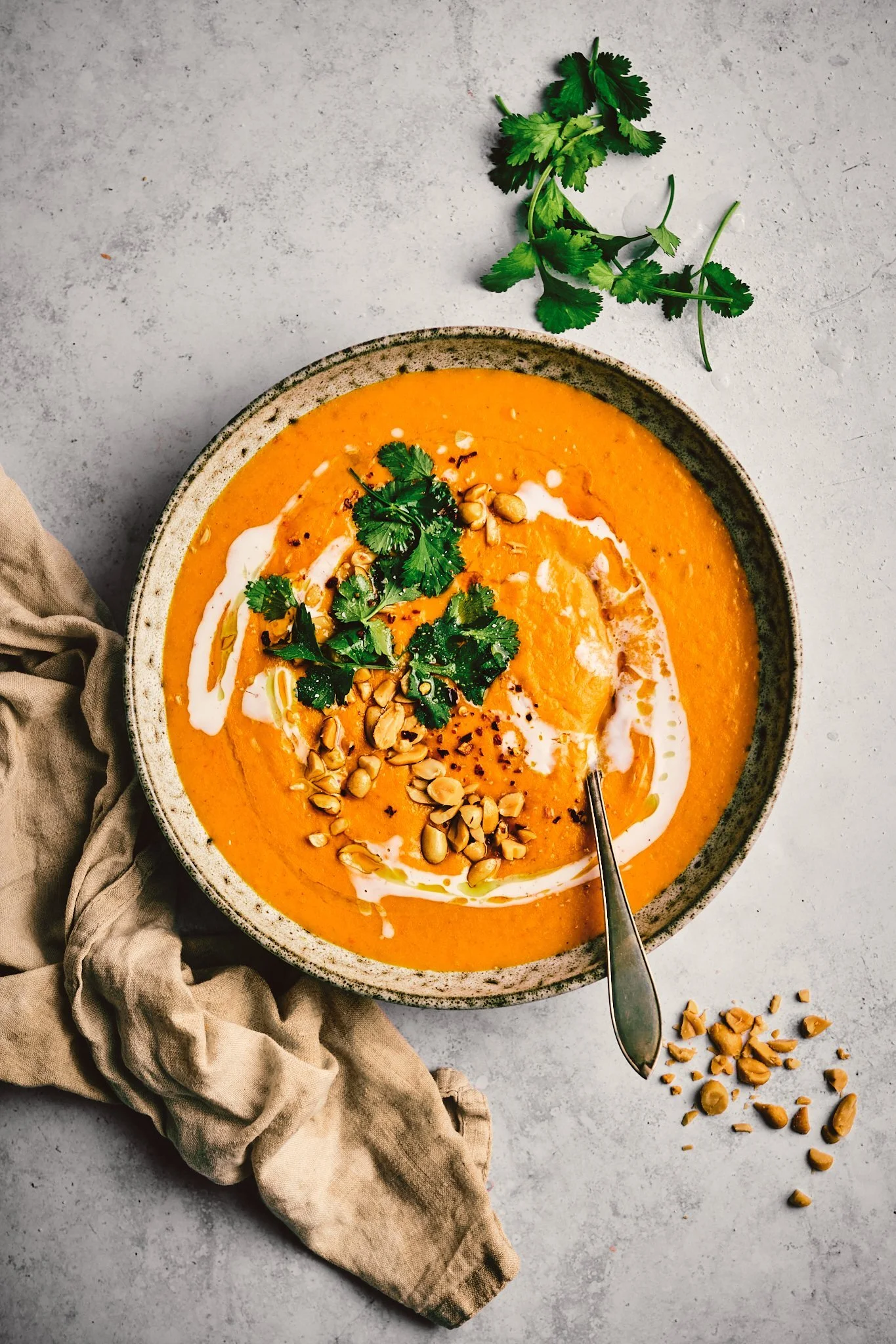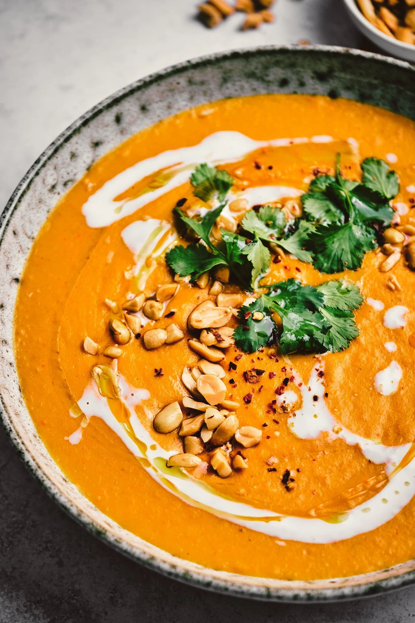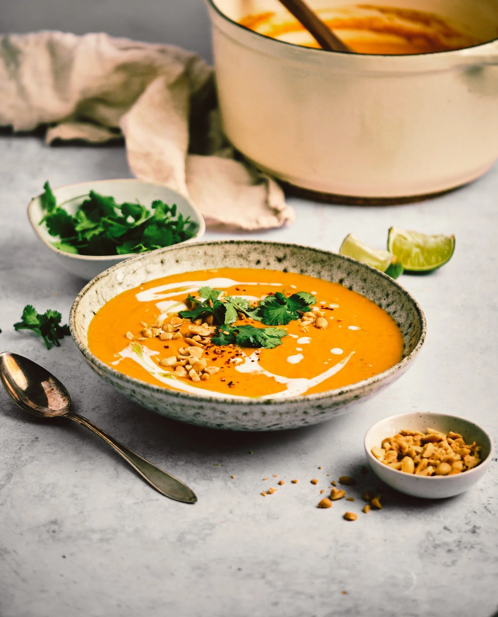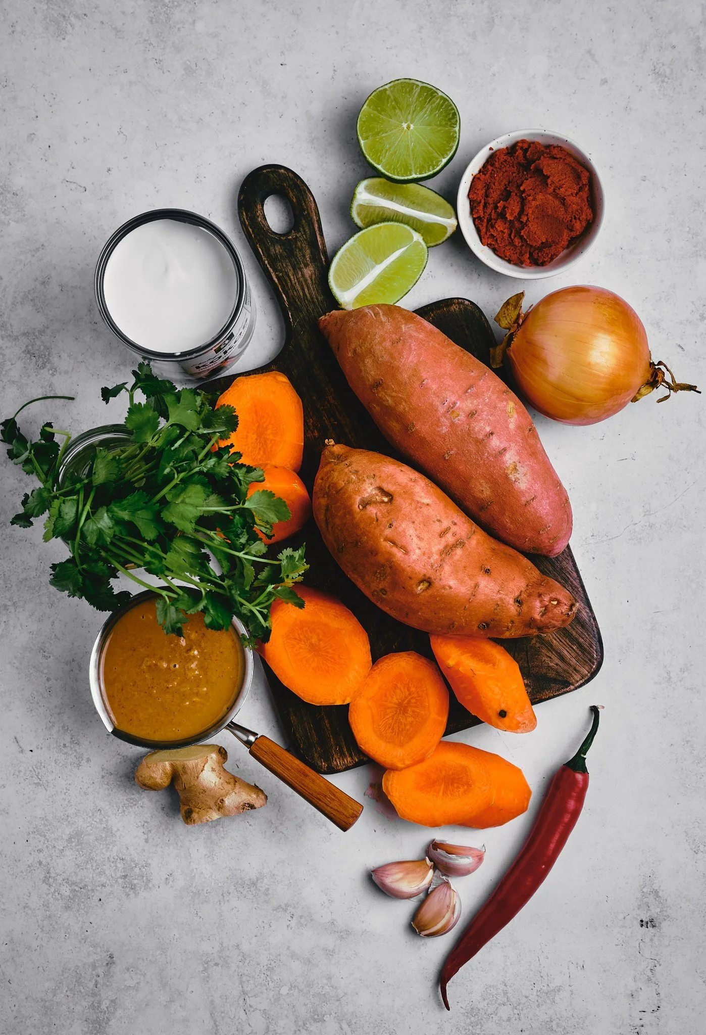 Idag delar jag med er ett recept på en fantastiskt god sötpotatissoppa med kokosmjölk, röd currypasta och jordnötssmör. En soppa som är perfekt som vardagsmiddag men även för att bjuda på vid finare tillfällen. Den tar 30 minuter att göra och är fylld med både smaker och näring från bland annat sötpotatis, morötter, lök, vitlök, kokosmjölk, jordnötssmör, ingefära och lime.