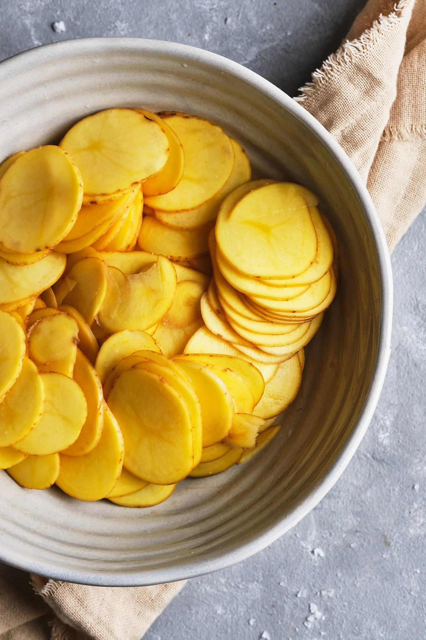 - Skär potatisen i mycket tunna skivor. Jag använde mandolin.