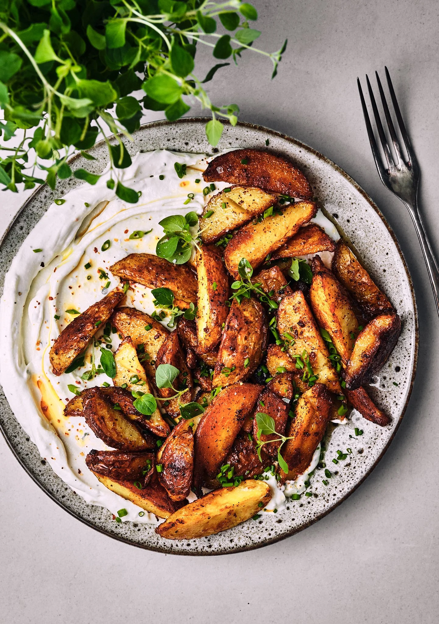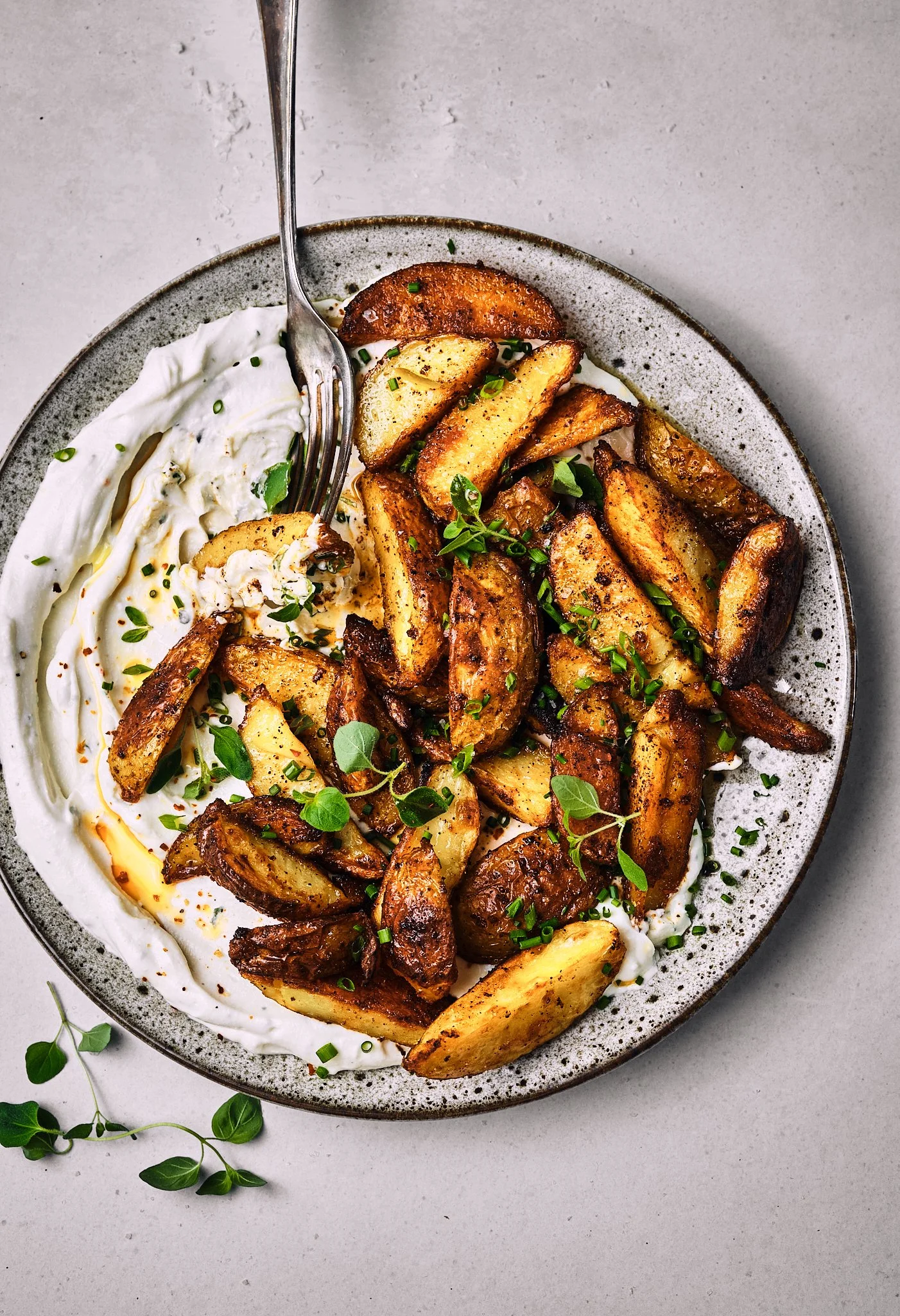 Krispiga potatisklyftor med krämig vegansk fetaoströra