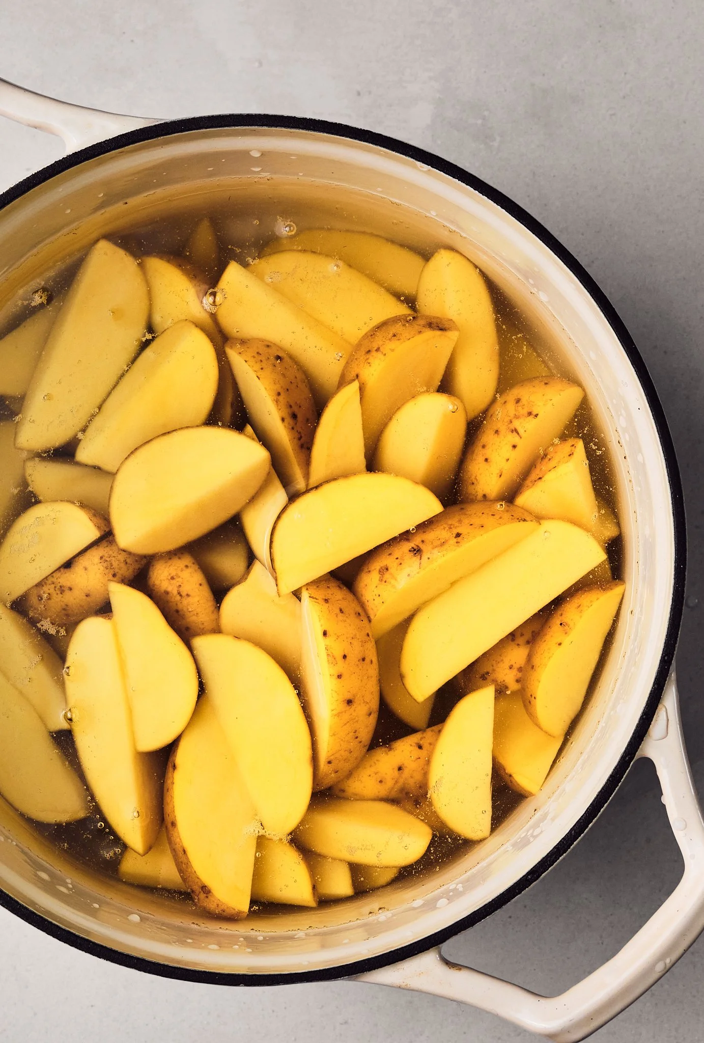 - Skär potatisarna i klyftor och koka i en kastrull i 10 minuter.