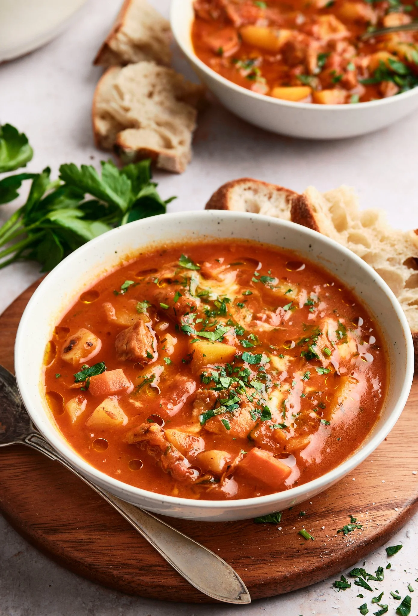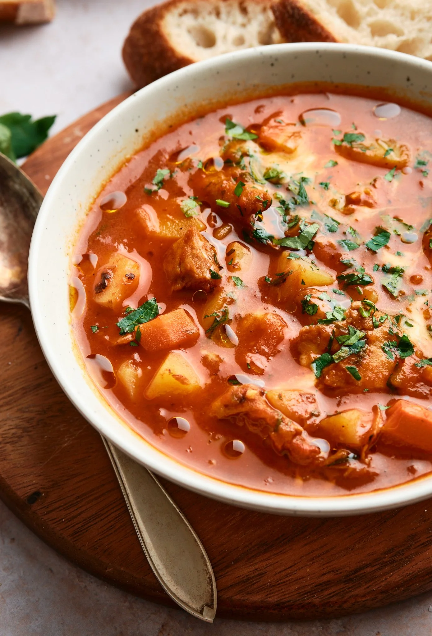 - Toppa med bladpersilja och servera med creme fraiche och gott bröd.
