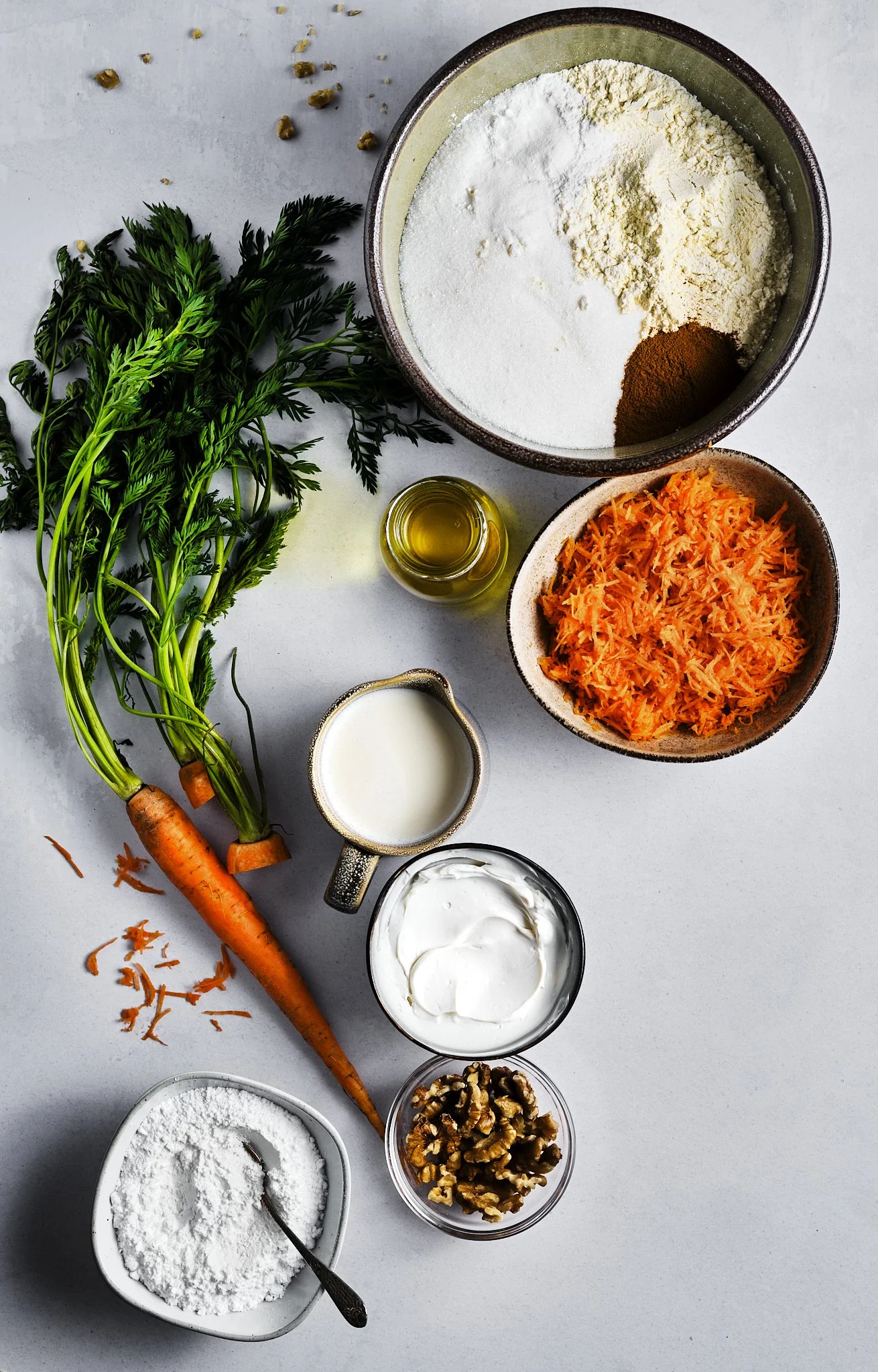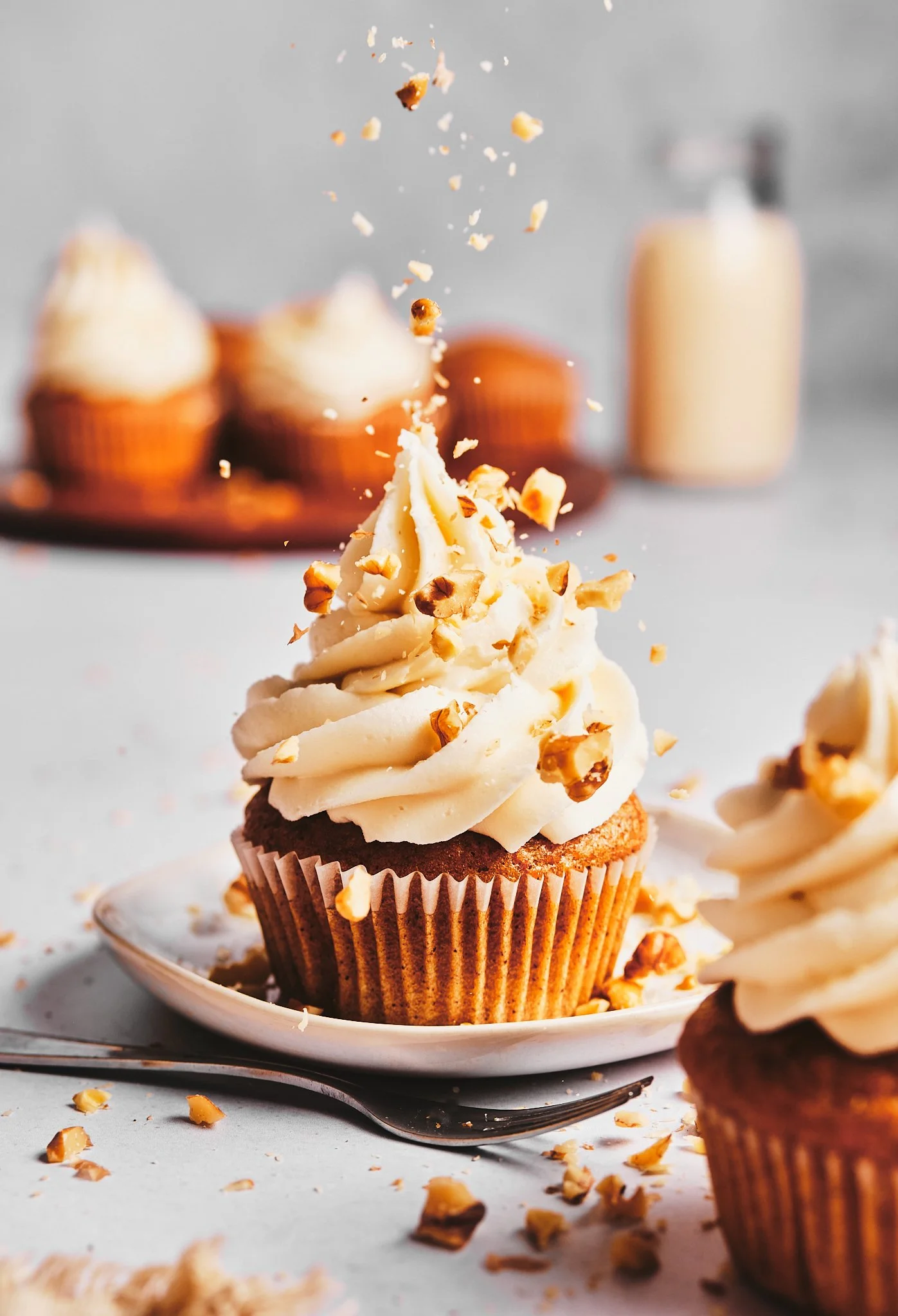 Saftiga veganska morotscupcakes med cream cheese frosting och valnötter