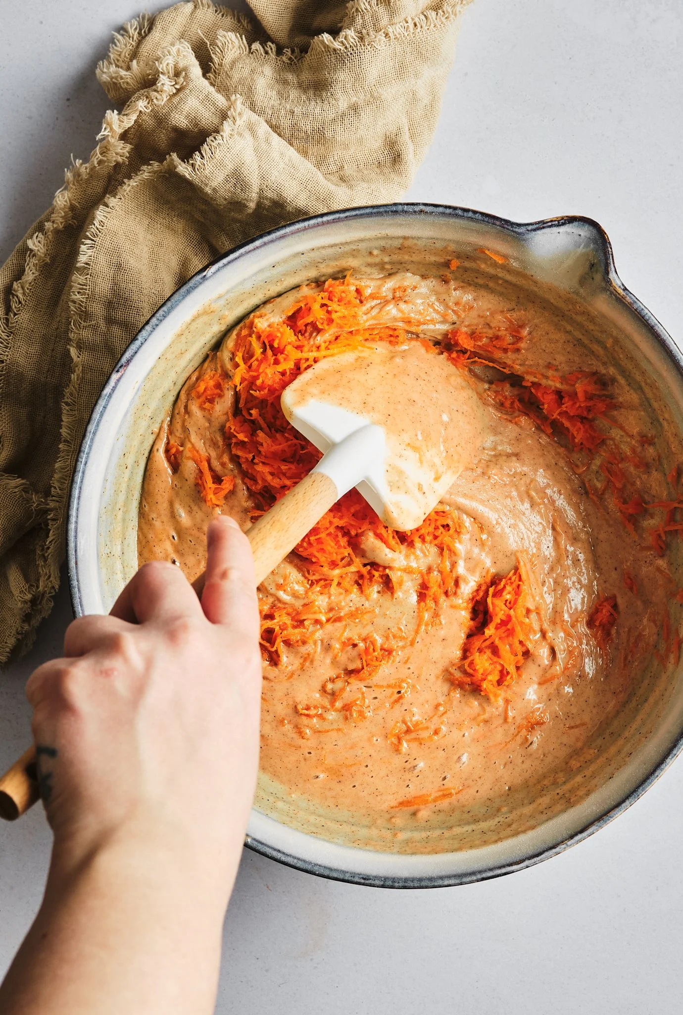 - Riv morötterna och rör dom ner i smeten med en slickepott.