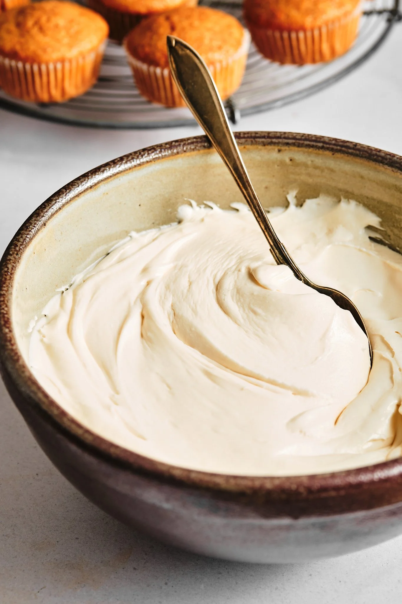 Frostingen är så god att jag skulle lätt kunna äta den med sked. Den är gjord på vegansk färskost, mjölkfritt margarin, florsocker och vaniljarom (vaniljsocker funkar självklart också). Det finns ingenting som passar lika bra ihop som morotskaka och cream cheese frosting!